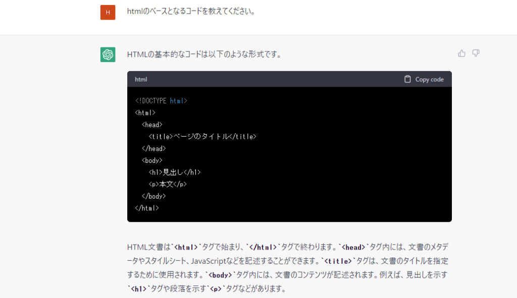 プログラミング言語のコード生成についても同様で、簡単なところで例えば「htmlのベースとなるコードを教えてください」という質問には以下のような内容で回答が返ってきます。
